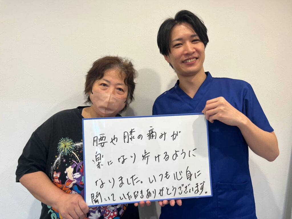 筋力回復とアライメント改善に伴い、膝内側痛は徐々に軽減。現在は日常生活動作における疼痛は安定し、再発予防を目的に継続的なケアを行っています。