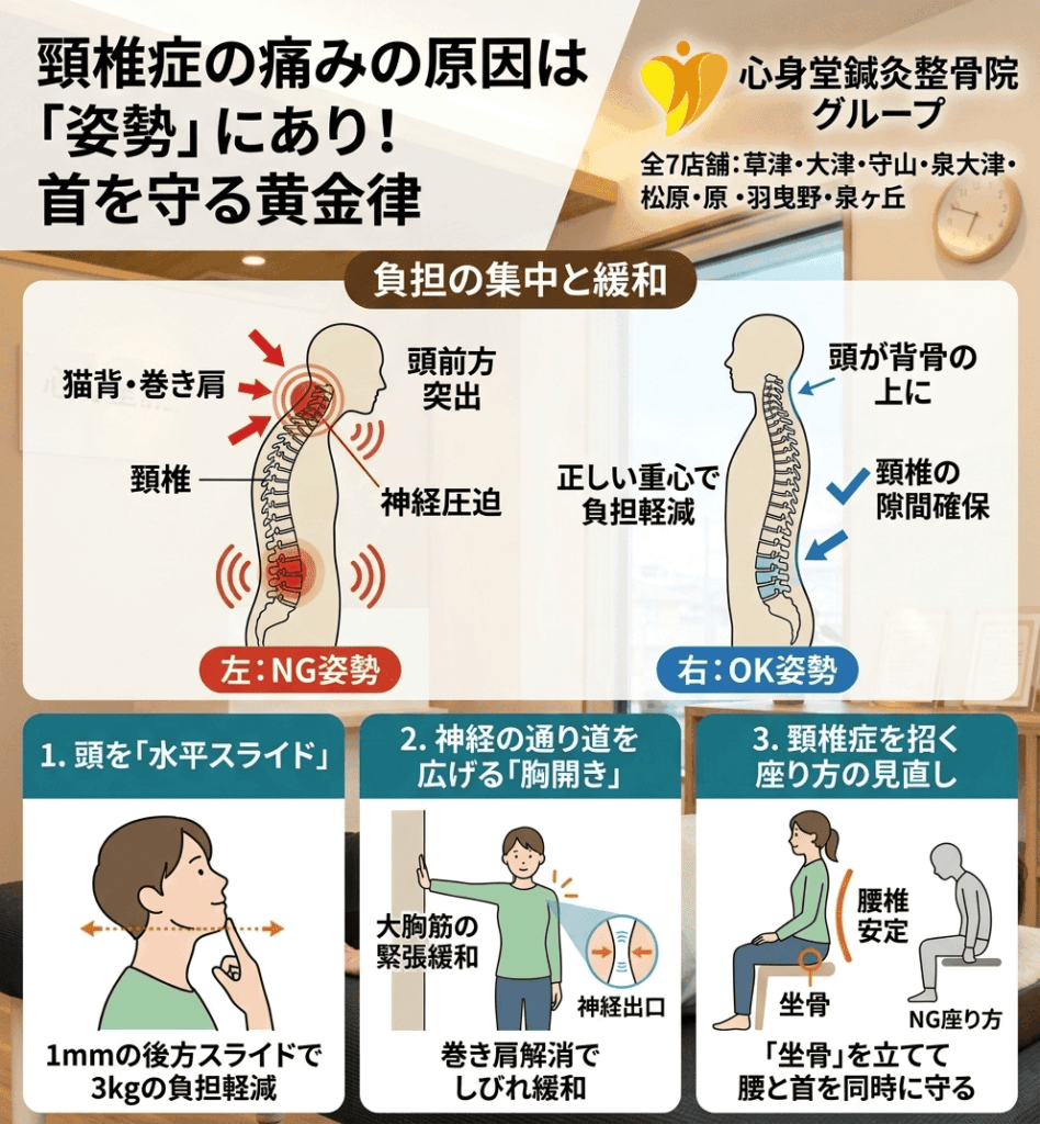 医学的根拠に基づいた、首への負担を物理的に減らす「知恵」を共有します。