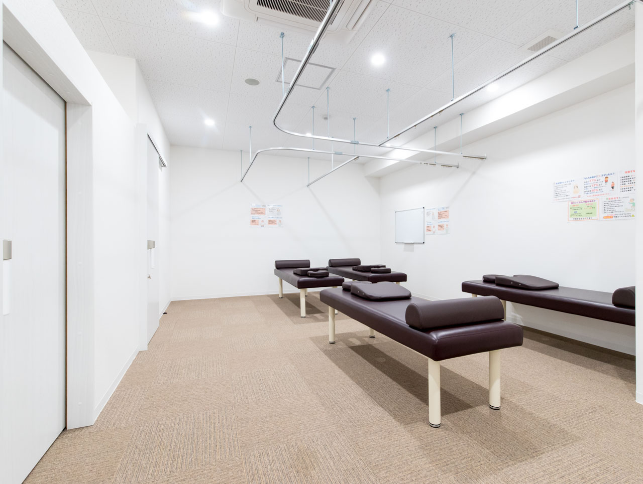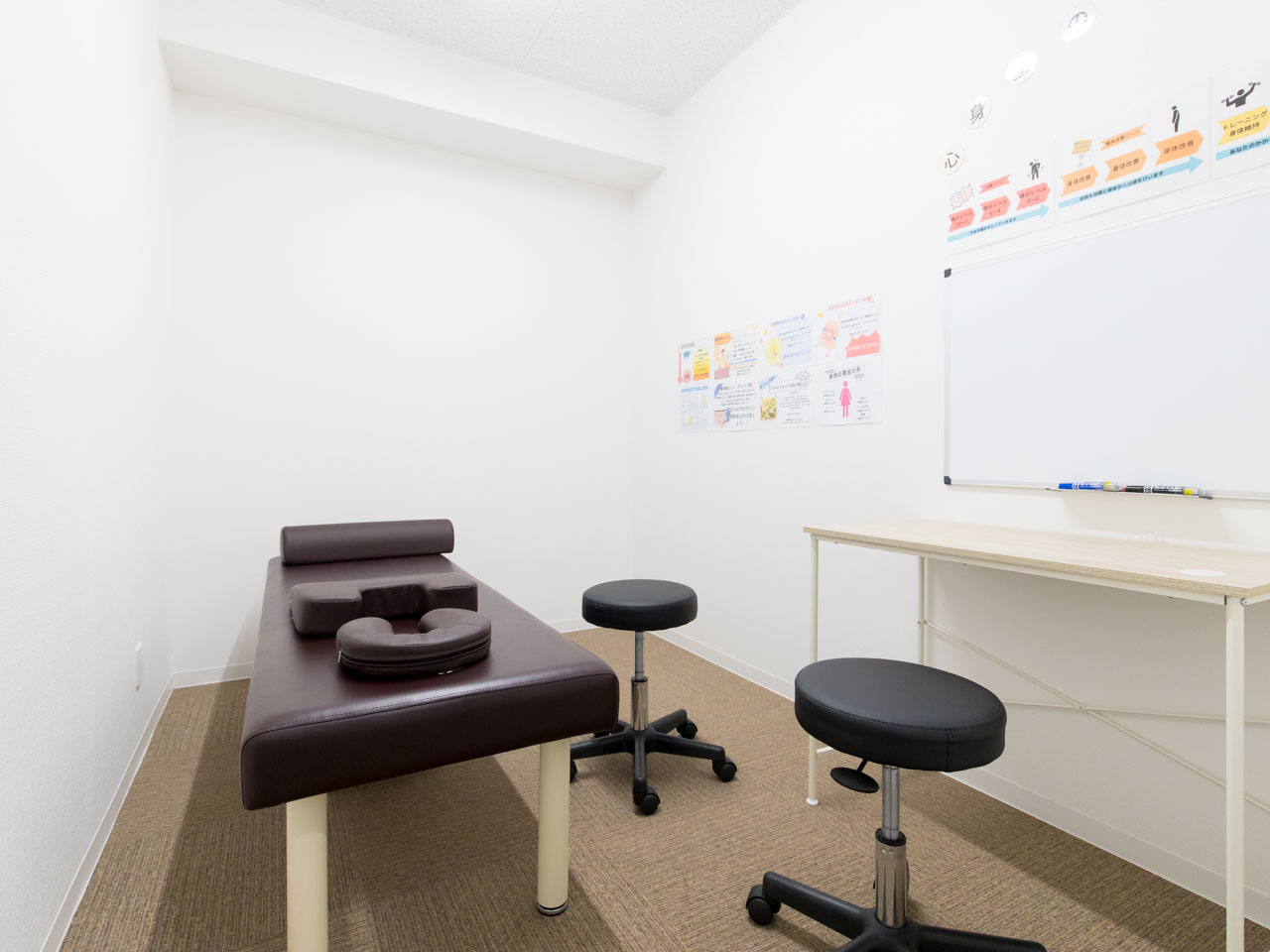 キッズスペース完備、ベビーカーのまま施術室へお入りいただけます。子育て中で忙しいママ・パパも、気兼ねなくご自身の身体のケアに集中できる環境です。