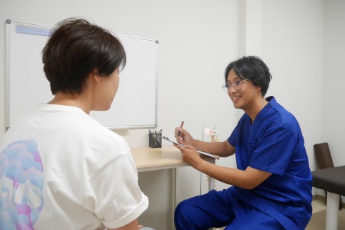 ご記入いただいた問診票をもとに、担当の施術者が詳しくお話をお伺いします。症状や痛み、お悩みのことはもちろん、普段の生活習慣などもお聞かせください。