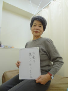 こちらに通い始めて4ゕ月が過ぎました。20年来肩の痛みに悩まされ、ストレスになっていたのが、痛みが和らぎうれしい限りです。